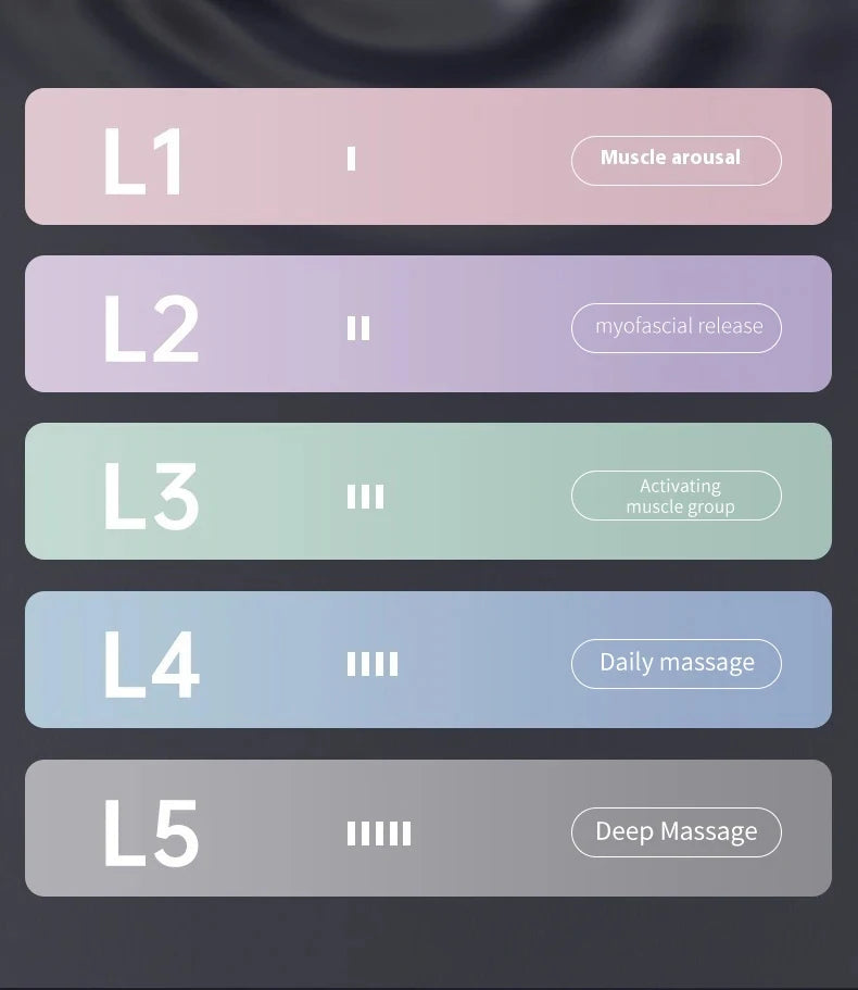 This image showcases the massage gun’s intelligent speed system with six adjustable levels. Levels 1–2 focus on gentle muscle relaxation, levels 3–4 help reduce lactic acid buildup after exercise, and levels 5–6 deliver intense professional-grade percussion for post-workout recovery.