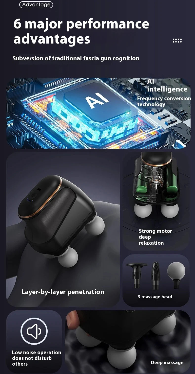 This image highlights a high-performance massage gun designed for deep tissue treatment. With multiple detachable heads—including finger, smoothing, bead, triangular, and wave types—it delivers customized therapy for different muscle groups.